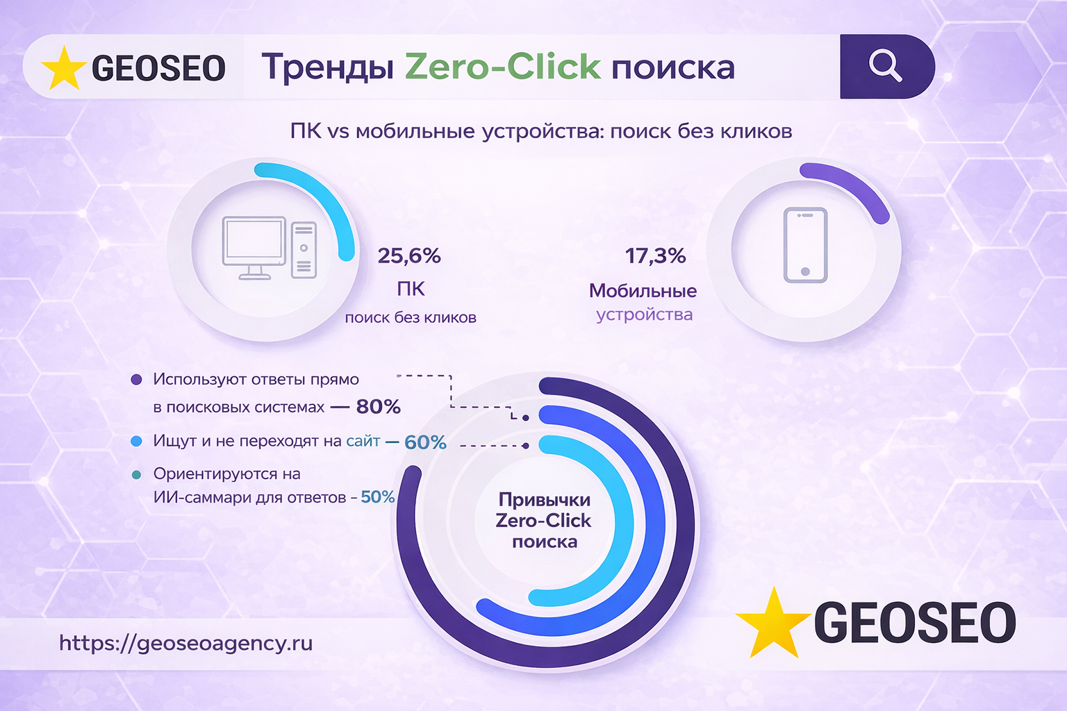 Растет доля поисков без клика: в США в марте 2025 zero-click был 27,2% против 24,4% годом ранее, а доля кликов по органическим результатам снизилась до 40,3%. В России растет исходящий органический трафик из нейросетей на сайты: за январь-октябрь 2025 рост был более чем в 9 раз, среди лидеров по доле назывались Perplexity, GigaChat и DeepSeek.
